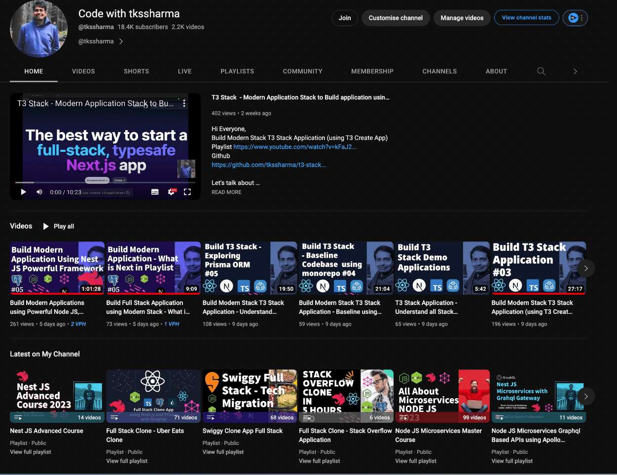Hi, I'm Tarun - a full-stack software developer based out of India. I build open-source projects and write about modern JavaScript, Node.js, design, and web development. If you like my stuff Please subscribe to My channel and feel free to hit One-click unsubscribe anytime. I have 2000 YouTube videos on the latest technologies.